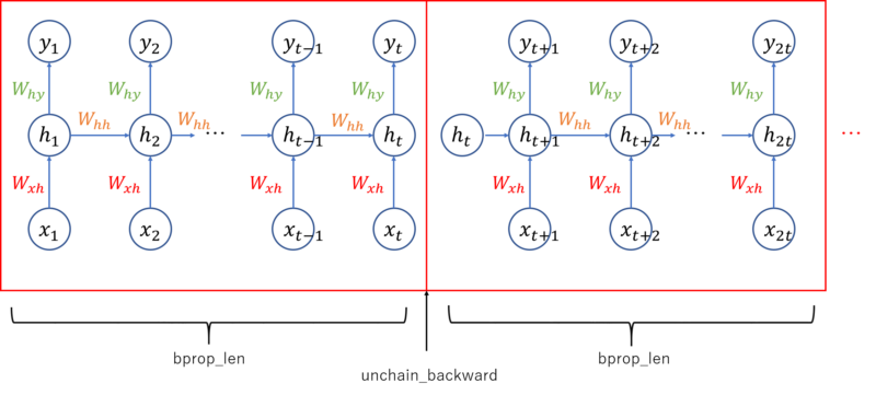 Note that unchain_backward is called every time at the end of the update_core function to truncate/cut the computational graph.