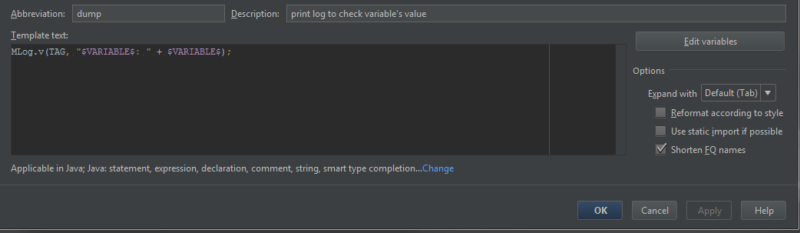 It is useful when you want to check variable’s value for debugging. Here $VARIABLE$ (You can use other than the name “VARIABLE” as well, just need to pinch with $, like $<variable_name>$.) can be used a variable which user specify after extracting this template.