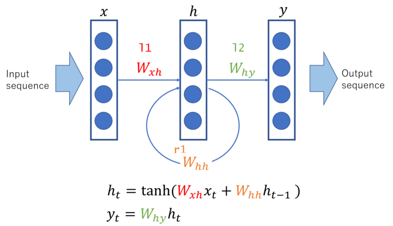 Here the subscript \(t\) represents the time step (sequence index). Due to this loop hidden layer unit \(h_{t-1}\) is fed again to construct hidden unit \(h_{t}\) of next sequence. Therefore, information of past sequence can be “stored” (memorized) in hidden layer and passed to next sequence.